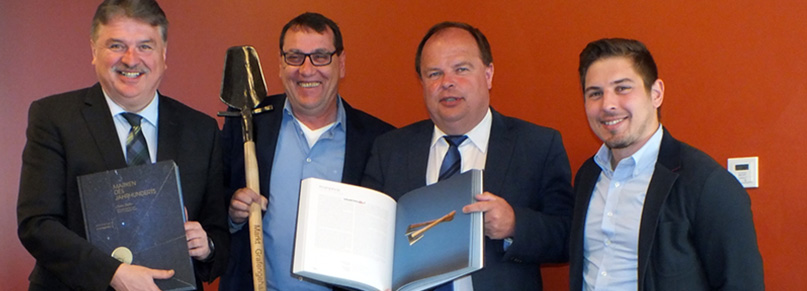 Firmenchef Claus Krumpholz übergab im Beisein seines Sohnes Claus ein Exemplar des Buches "Marken des Jahrhunderts" an Landrat Klaus Peter Söllner.